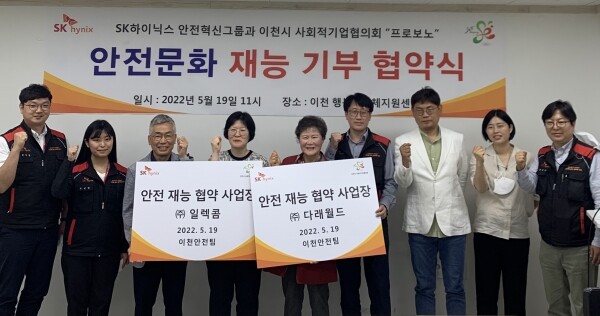 ㈜SK하이닉스 안전팀 담당자에 따르면 이번 업무협약은 안전혁신그룹 구성원들의 프로브노 활동으로 지역사회에 대한 안전 재능기부활동이 사회적가치실현을 목적으로 기업을 경영하는 사회적기업과의 ‘가치나눔’으로 확산되기를 바라며 올해 이천시 사회적기업 2곳, ㈜일렉콤과 ㈜다래월드를 시작으로 이천시 사회적기업들이 안심하고 제품생산과 작업자 안전을 보호할 수 있도록 안전팀 부서원들의 재능을 나눔해 기본적인 공장안전진단은 물론 일정기간 동안 정기적인 안전관리 교육, 안전관리 기술지원을 통해 기업과 작업자 스스로 안전관리를 책임질 수 있도록 지원하는 업무협약 을 체결하게 됐다고 한다.