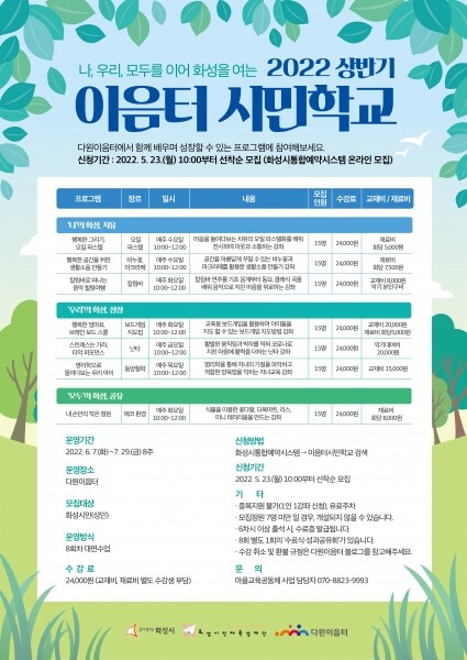 시민학교 모집에 대한 자세한 사항은 다원이음터 블로그와 화성시통합예약시스템 프로그램 안내를 통해 확인할 수 있다.