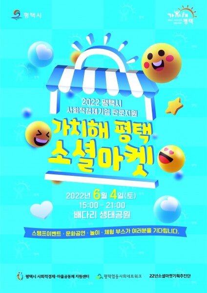 또한 지난해 개발된 평택시 사회적경제 공동브랜드인 ‘가치해평택’의 홍보도 함께 진행되어 사회적경제 분야에 대한 인식을 확산하고 시민들의 관심을 이끌어내 사회적 가치를 실현하는 발판이 마련될 것으로 보인다.