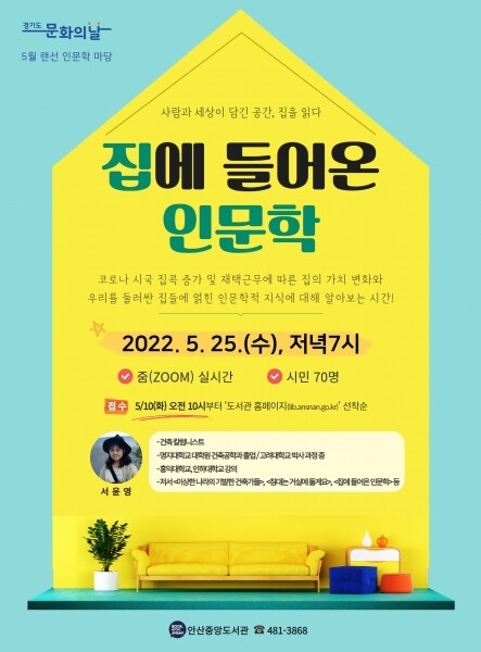 오는 25일 오후 7시 진행되는 서윤영 작가 초청 강연 ‘집에 들어온 인문학’은 코로나19로 집에 머무는 시간이 늘어남에 따라 집의 가치 변화와 집에 얽힌 인문학적 지식을 온라인 화상회의 프로그램으로 알아본다.