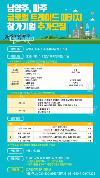 한편 이번 '글로벌 트레이드 패키지 지원사업'은 올해부터 파주시와 남양주시에서 코로나19를 극복하고자 기존의 시장개척단을 확대해 추진하는 사업이다.