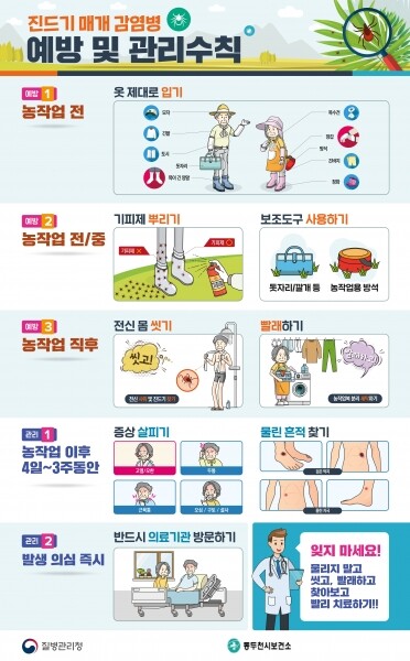 따라서 농작업, 제초작업, 산책 등 야외활동 시 긴 소매, 긴 바지 등 안전하게 옷을 입기 기피제 뿌리기 귀가 후 바로 샤워하고 입은 옷은 세탁하기 등의 예방수칙을 준수해 진드기 물림사고를 방지하는 것이 가장 중요하다.