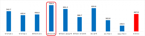 각 세부지수 별로 가장 큰 영향을 미친 지표는 기업지수의 경우 약 3배 증가한 벤처기업 연구개발비, 투자지수 중에서는 7배 넘게 증가한 벤처투자액, 정부지수에서는 9배 가까이 증가한 모태펀드 출자금액으로 나타났다.