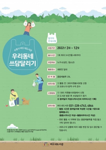 ‘우리동네 쓰담달리기’는 1365자원봉사포털, 버드내도서관 카페에서 참여 신청할 수 있다.