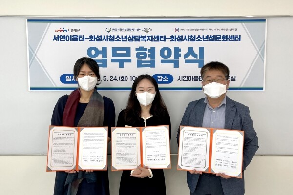이날 협약식에는 권혜진 서연이음터센터장, 백중하 화성시청소년상담복지센터장, 신혜선 화성시청소년성문화센터장 등 관계자 7명이 참석했다.