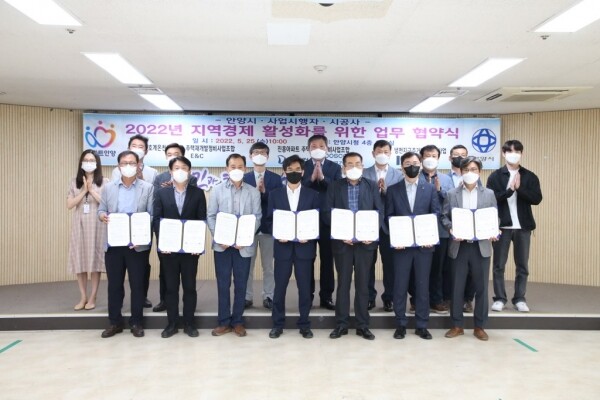 안양시 도시주택국장을 포함한 기술직 간부공무원 8명과 사업시행자·시공사 간 2022년 지역경제 활성화를 위한 업무협약 체결이 25일 안양시청사 4층 대회의실에서 있었다.