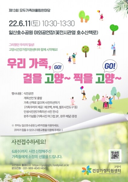 행사는 고양시건강가정지원센터 홈페이지에서 사전 접수를 통해 참여 가능하며 사전접수 가정에게는 소정의 선물을 증정한다.