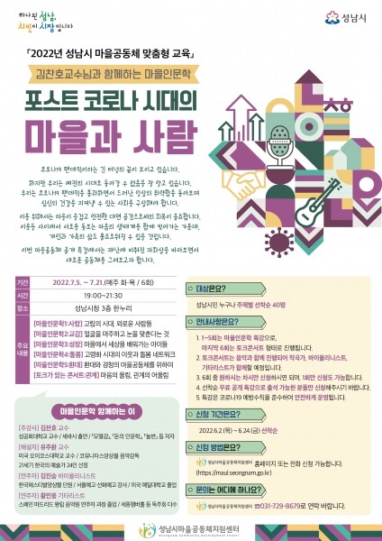 보다 더 용이한 참여를 위해 날짜별 신청이 가능하며 모집인원은 날짜별 선착순 40명으로 총 240명 대상이다 신청은 6월2일 9시 부터 성남시마을공동체지원센터 홈페이지와 전화로 진행된다.