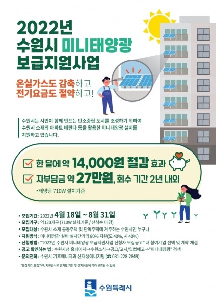 수원시 관계자는 “미니태양광 발전설비를 설치하면 한 달에 약 1만 4000원의 전기요금을 줄이는 효과가 있어 본인 부담금을 2년 내외 기간에 회수할 수 있다”며 “온실가스를 감축하고 신재생에너지를 생산하는 친환경 태양광발전 설비를 많은 가정에서 설치하길 바란다”고 말했다.