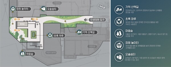 세부적으로 안전하게 걷고 감각 자극 콘텐츠로 신체활동 증진을 지원하는 ‘기억산책길’ 정서적 안정과 오감을 자극하며 내·외부 연계가 가능한 실내 공간 ‘마음 숲’ 원예·색채 치유, 가상 체험 등 어르신 다감각 치유 공간인 ‘초록마루’ 오감자극 놀이와 신체활동으로 감각을 향상하는 ‘오솔쉼터’ 반려식물 재배, 원예 활동 등을 통해 사회적 교류를 증진하는 ‘정원놀이터’ 등을 조성하고 어르신의 자존감 향상을 위해 커뮤니티, 일자리 사업과 연계해 ‘인생정원 해설사’를 운영할 계획이라고 전했다.