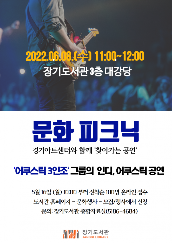 공연신청은 5월 16일 10:00부터 장기도서관 누리집에서 온라인으로 진행하며 선착순 100명까지 접수 가능하다.
