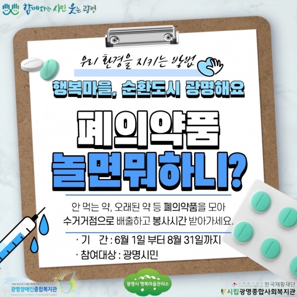 작년에도 많은 시민이 캠페인에 참여한 바 있으며 올해도 재진행 요청에 힘입어 광명3·5·7동 행복마을관리소 외에 광명종합사회복지관, 광명장애인종합복지관과 협업해 총 5개소의 폐의약품 수거 거점을 운영한다.