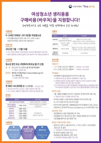 지원 대상은 이천시에 주소지를 둔 만9세부터 만24세까지 중 생계·의료·주거·교육급여 수급자 법정 차상위 계층 한부모가족지원법에 따른 여성청소년이다.