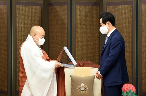 서울 대한불교조계종 총무원 4층 접견실에서 열린 이날 자리에는 대한불교조계종 총무원장 원행 스님, 의정부불교사암연합회 회장·의정부 성불사 주지 도심 스님, 남양주 봉선사 주지 초격 스님 등이 참석했으며 총무원장 원행 스님이 지역 사찰의 전통문화 보존 및 기여에 대한 감사의 마음을 담아 감사패를 안병용 의정부시장에게 전달했다.