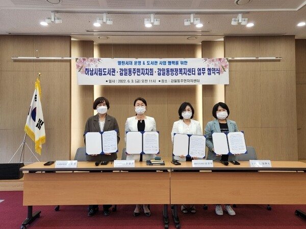 이날 협약식에는 감일동주민자치회 유정희 회장과 회원을 비롯해 진일순 도서관정책과장, 금미경 도서관운영과장, 최현숙 감일동행정복지센터 동장 등이 참석했다.