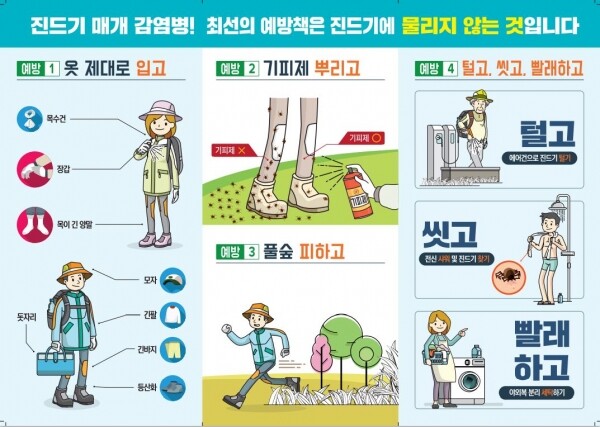 평택시 송탄보건소 관계자는 “야외활동 후 2주 이내 가피, 발열, 설사, 근육통 등의 증상이 있거나 진드기에 물렸을 경우에는 즉시 의료기관에 방문할 것”을 당부했다.