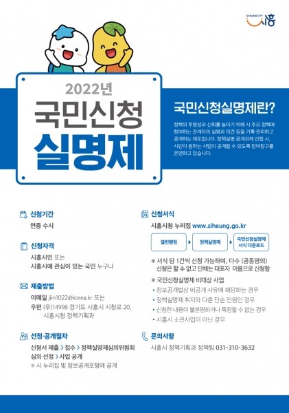 아울러 신청사업은 시흥시정책실명심의위원회의 심의의결을 통해 최종 선정되며 올해 선정된 사업은 시 누리집 및 정보공개포털을 통해 공개할 예정이다.