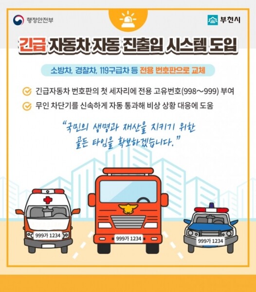 지난 2021년 11월 ‘자동차 등록번호판 등의 기준에 관한 고시’ 개정으로 소방차, 경찰차, 구급차 등에 998 또는 999로 시작하는 전용 번호판을 발급, 무인 차단기가 이 번호를 인식해 긴급자동차가 자동으로 통과할 수 있게 됐다.