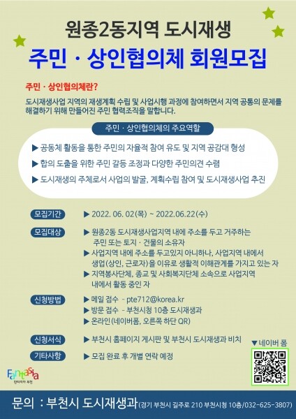 모집인원은 100명 내외로 신청서류 작성 후 이메일로 제출하거나 부천시청 도시재생과로 방문 접수하면 된다.