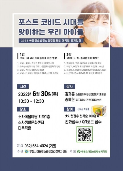 코로나19 일상회복의 일환으로 아동·청소년의 건강한 학교생활 및 또래관계 적응을 돕기 위해 마련됐으며 오는 30일 오전 10시 30분부터 소사어울마당 지하 1층에서 진행된다.