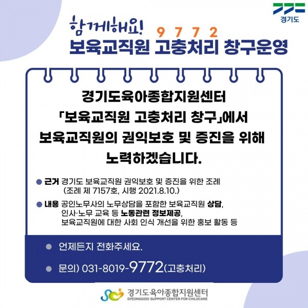 ‘보육교직원 고충처리 창구’는 ‘경기도 보육교직원 권익보호 및 증진을 위한 조례’에 따라 올해 처음 추진하는 사업으로 도내 설치된 어린이집의 보육교직원이라면 누구나 영유아보육법과 2022년 보육사업안내 어린이집 운영, 교사 업무 및 처우 상담 공인노무사를 통한 전문 인사·노무 상담 심리상담 등을 받을 수 있다.