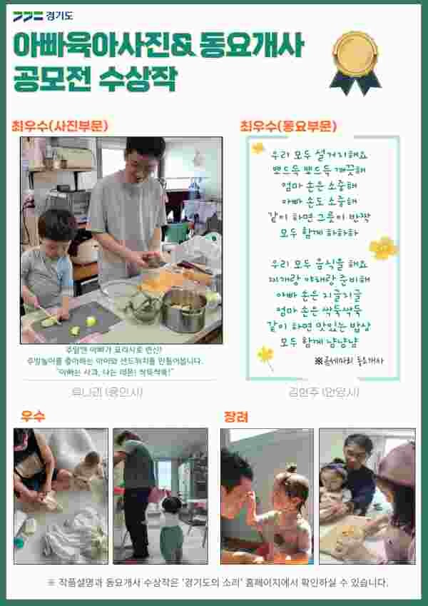 경기도는 성평등 문화 확산을 위해 지난 4월 ‘아빠육아사진&동요개사’ 공모전을 진행한 결과 류나리 씨 등 총 10편의 수상작을 선정했다고 9일 밝혔다.