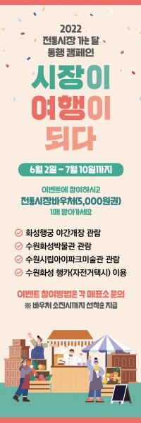 수원시 관계자는 “전통시장 가는 달 이벤트가 침체한 지역경제와 관광산업에 활력을 불어넣길 바란다”며 “하반기에도 한국관광공사 등 관계기관과 적극적으로 협력해 수원시 관광산업과 지역경제를 활성화할 수 있는 사업을 추가로 진행할 계획”이라고 밝혔다.