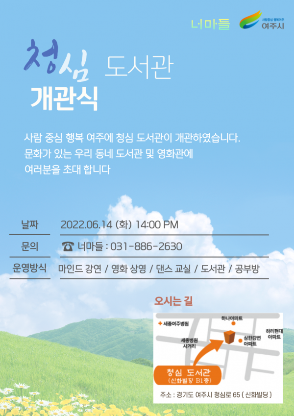 청심 도서관은 2022년 여주시 마을공동체 주민제안 공모사업 공간조성 분야에 선정되어 보조금을 지원받아 조성된 공간이다.