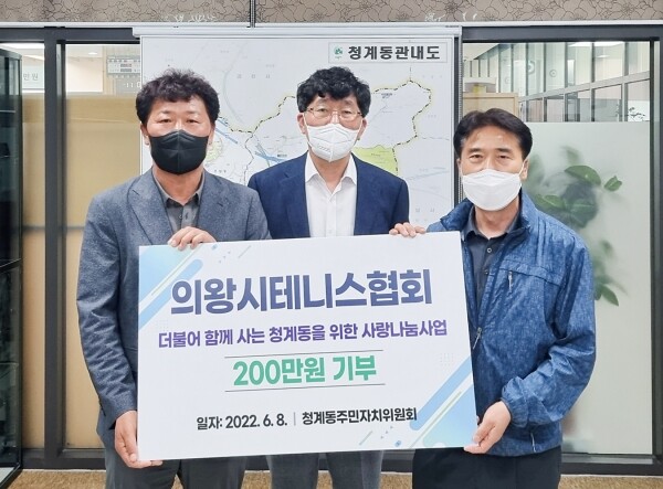 의왕시테니스협회 임원, 주민자치위원회 임원 등이 참석한 가운데 전달한 이번 성금은 청계동 지역의 소외된 이웃, 생계가 어려운 취약계층을 지원하는데 사용될 예정이다.