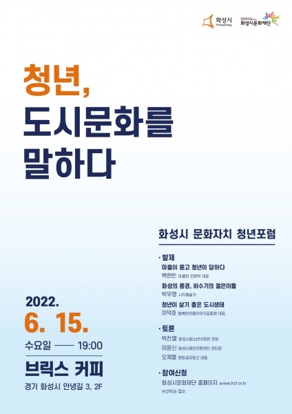 ‘청년, 도시문화를 말하다’라는 주제로 열리는 이번 포럼에서는 마을이 묻고 청년이 답하다 화성의 풍경, 비수기의 젊은이들 청년이 살기 좋은 도시생태 순으로 발표가 진행되며 이어지는 토론에는 박찬열 화성시청소년수련관장, 이윤신 화성시청년지원센터장, 오제열 문화공유창고 대표 등이 참석한다.