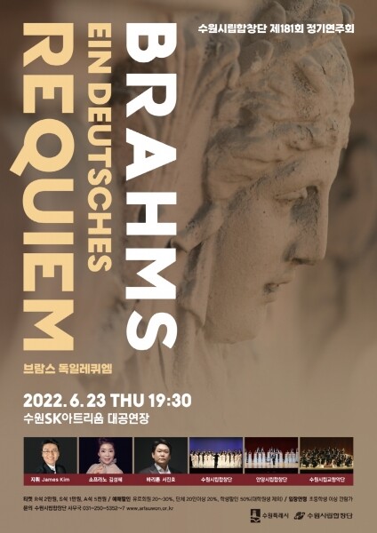 영혼 깊이 스며드는 숭고한 감동, 수원시립합창단 제181회 정기연주회 ‘브람스_독일레퀴엠’의 티켓 가격은 R석 2만원, S석 1만원, A석 5천원이며 초등학생부터 관람가능하다.
