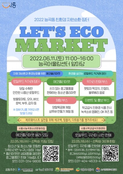 능곡어울림센터 입주기관인 시흥시능곡청소년문화의집, 시흥시학교급식지원센터, 시흥도시공사, 능곡동 행정복지센터가 공동 주관하는 ‘LET’S ECO MARKET’은 오는 11일 토요일 오전 11시부터 오후 4시까지 능곡어울림센터 앞마당에서 진행된다.