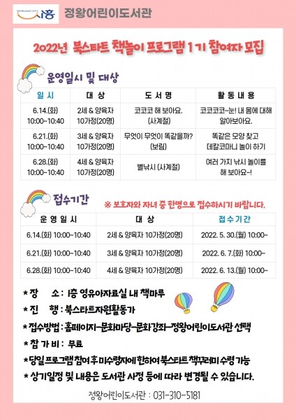 북스타트 책놀이 프로그램 1기는 6월 14일을 시작으로 3주 동안 매주 화요일 10시에 총 3회 진행된다.