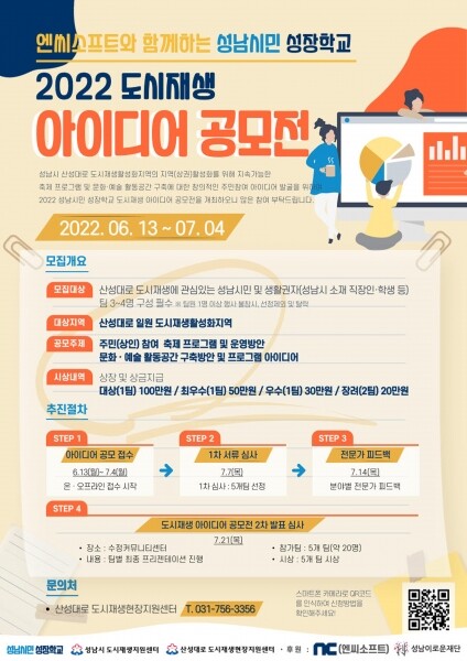 성남시 관계자는 “지역의 문제점을 발굴·해결하는 방식의 지역맞춤형 도시재생 사업을 펴나가기 위해 엔씨소프트 등 6개 협약기업·기관이 민관 협력체제를 구축한 상태”며 “이번 공모는 협약기업·기관들이 공동 기획해 추진 중인 ‘성남시민 성장학교 협력사업’ 중 하나”고 말했다.