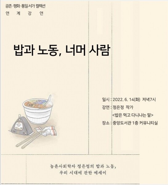 이번 강좌는 ‘3층 자료실의 ’공존·평화·통일‘ 서가의 ’공존‘ 연계 강연으로 우리가 일상에서 먹고 사는 일의 구체성과 먹거리와 관련된 현장에서 일하는 사람들의 목소리를 전하며 밥과 노동, 사람과 세상에 대해 생각해 보는 시간으로 진행된다.