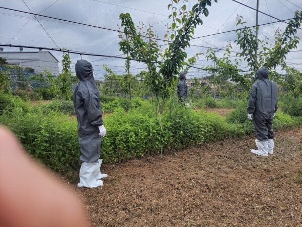 이에 배 적과 및 봉지씌우기 영농철을 맞아 과수화상병 유입 차단을 위해 작업자와 농기자재의 철저한 소독을 실시해 줄 것을 당부하고 과원 청결관리를 위해 외부 활동용과 구별해 작업용 신발, 작업복, 장갑 등 착용을 해줄 것과 주변 과수원 방문 자제 및 작업 중 작업자와 작업도구를 70% 알코올이나 치아염소산나트륨 0.2%가 함유된 락스 또는 일반 락스를 20배 희석해 수시로 소독해 줄 것을 거듭 당부했다.