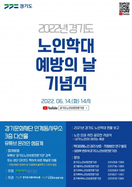 도가 주최하고 경기도사회서비스원 주관으로 진행될 이번 행사는 경기도노인보호전문기관 유튜브 채널을 통해 온라인 생중계된다.