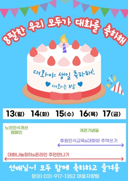 이번 행사에서 대화노인복지관의 선배시민 봉사단 ‘마실봉사단’에서 수세미 나눔을 통해 축하의 의미를 지역사회와 나누고 ‘대화실버경찰대’가 행사 진행을 도우며 선배시민으로서의 역할을 수행할 예정이다.