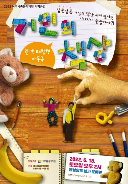 ‘거인의 책상’은 우리 주변에서 흔하게 볼 수 있는 조그만 사물들이 거대한 책상을 통해 집채만큼 커진 낯선 세상에서 벌어지는 이야기를, 영상장비를 활용해 소상하게 그려내고 관객들이 무대로 올라와 직접 참여하는 참여형 공연이다.