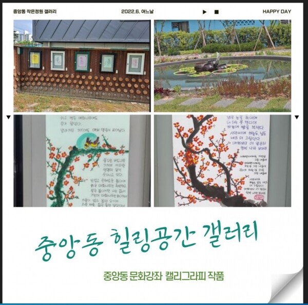 중앙동 문화강좌 캘리그라피는 2021년에 개강한 강좌로 수강생들은 재능과 실력을 마음껏 발휘했으며 마을 휴식공간으로 조성된 작은정원에 지역주민들에게 작품을 게시해 함께 공감하고 힐링할 수 있는 갤러리 공간을 마련했다.