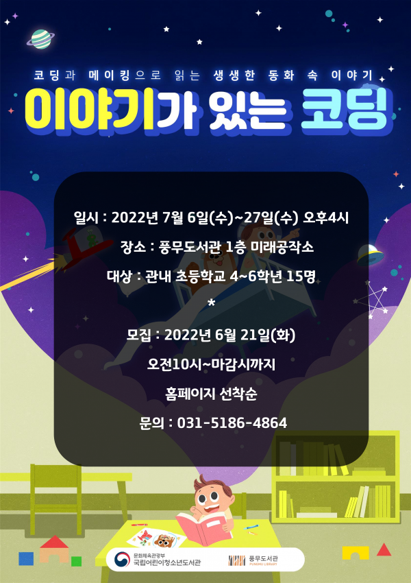 이번 강의는 7월 6일부터 27일까지 매주 수요일 오후 4시에 풍무도서관 1층 미래공작소에서 진행되며 강의 접수는 초등학교 4학년부터 6학년 학생 15명을 대상으로 6월 21일 화요일 오전 10시부터 홈페이지를 통한 온라인 선착순으로 이루어진다.