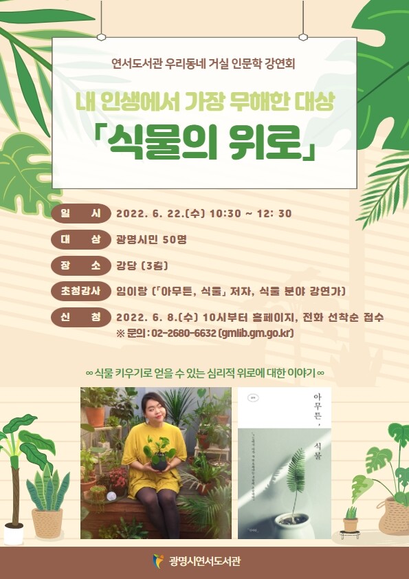 이번 강연회는 ‘아무튼, 식물’, ‘조금 괴로운 당신에게 식물을 추천한다’의 저자이자 식물 분야 강연자인 임이랑 작가를 초청해 식물 키우기로 얻을 수 있는 심리적 위로에 대해 소통하며 그동안 코로나 펜데믹 속에서 지쳤던 심신을 다독이고 치유하는 시간을 가질 예정이다.
