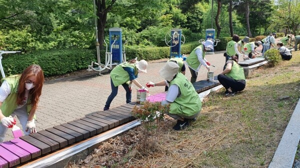 ‘나눔이 꽃피는 마을’은 올해 호평동 주민자치센터 특성화 사업으로 산책길의 미관상 보기 좋지 않은 노후된 벤치를 새롭게 페인팅해 마을 환경을 개선하기 위한 목적으로 실시됐다.