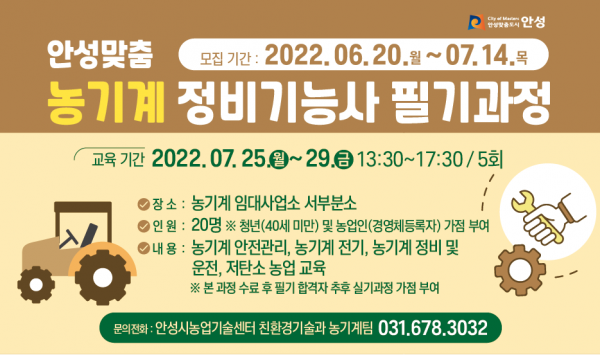 조준희 안성시 친환경기술과장은 “청년 농기계 정비인력 양성을 위해 교육을 구성했다”며 “앞으로도 농기계 분야 전문인력 양성을 위해 노력하겠다”고 말했다.