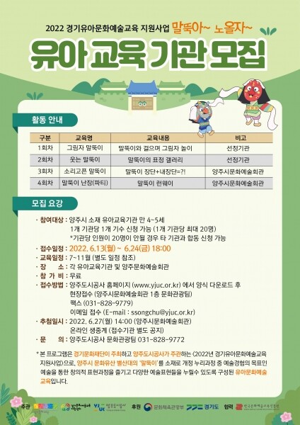 교육신청은 6월 13일부터 6월 24일까지 양주시문화예술회관에 방문하거나, 팩스·이메일을 통해 가능하다.