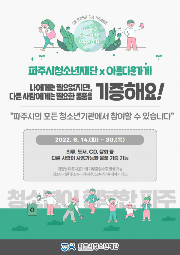 한편 파주시청소년재단과 아름다운가게는 지난 3월 출판도시에서 개최한 도서나눔행사 아름다운 하루를 시작으로 5월 업무협약을 체결하고 6월 5일 환경의 날 기증캠페인 등 ‘청소년의 참여로 지속가능한 파주’를 만들어가기 위한 다양한 노력을 하고 있다.