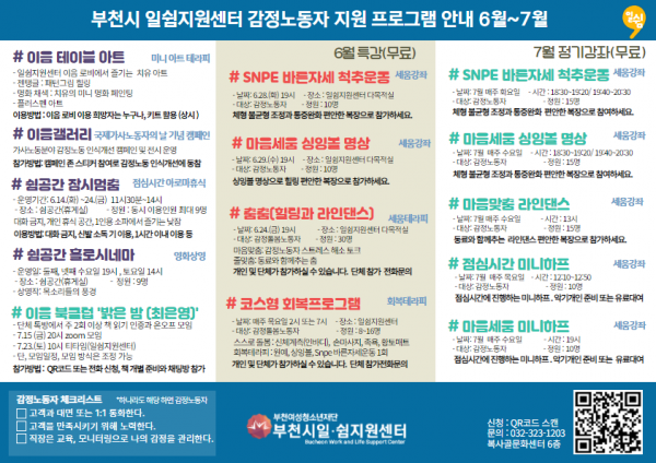 감정노동자의 건강증진과 일상 회복을 위한 문화예술, 신체활동 프로그램인 세움 강좌는 감정노동자의 스트레스에 의한 근골격계 질환 예방 및 통증 완화를 위한 ‘SNPE’, 동료와 함께하는 ‘라인댄스’, 감정노동 심리적 회복 ‘미니하프’와 ‘싱잉볼명상’ 과정 참가자를 모집한다.