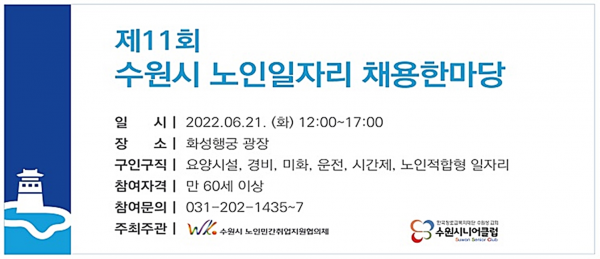 수원시 민간취업지원협의체가 주최하고 수원시니어클럽이 주관하는 이날 노인일자리 채용 한마당에는 수원시에 거주하는 만 60세 이상 어르신은 누구나 참여할 수 있다.