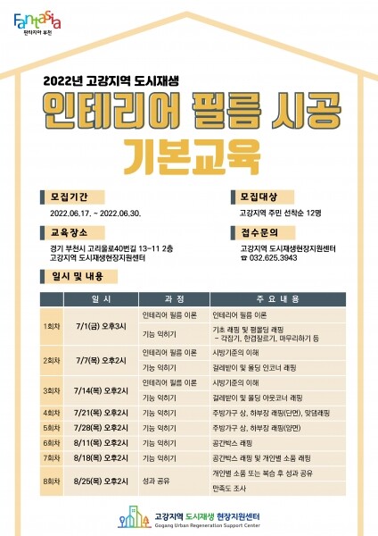 ‘2022 고강지역 도시재생 인테리어 필름 시공 기본교육’은 고강지역 도시재생 뉴딜사업의 일환으로 주민이 참여해 원도심 노후 주거 환경을 개선하고자 추진하는 사업이다.