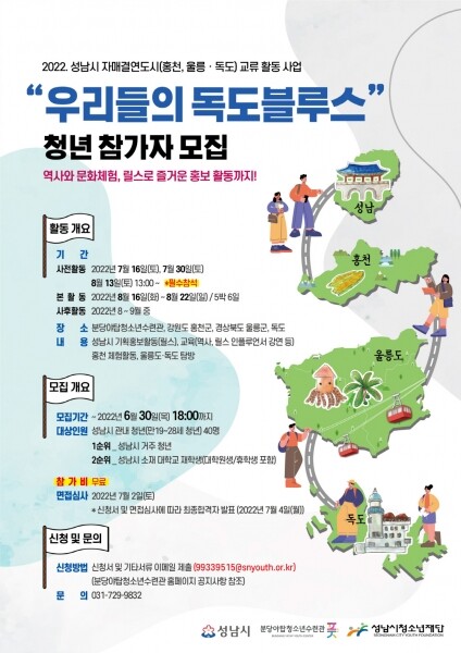 8월 16일부터 22일까지 5박 6일 동안 성남시 자매결연도시 홍천군, 울릉군을 거처 독도로 향하는 ‘우리들의 독도블루스’참가자들은 각 도시의 랜드마크 체험, 정보·문화교류 활동을 통해 성남 홍보대사로서 역할을 수행하게 된다.